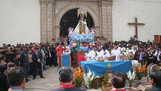 Esta fastuosa fiesta comienza el 15 de julio, que se da inicio con el estallido de un cohete, el mismo que es contestado por cameretazos y repique de campanas, la interpretación de dianas a cargo de las bandas musicales; seguidamente se efectúa la entrada de comparsas y el “cera apaycuy”, la noche es oportuna para iniciar el “qonoy” o fogata, donde los Q’olqas, los Chunchus y los Maqtas escenifican el purgatorio, haciendo alarde de sus picardías, carreras y saltos acrobáticos. A partir de las 22:00 horas el Prioste con su banda de músicos y comparsas dan la serenata a la Virgen, interpretando el “punchauniykipi”, hasta el amanecer del día 16 que es el día central.