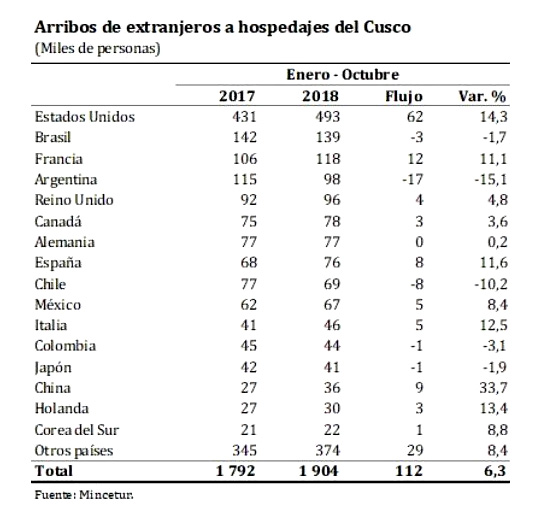 De acuerdo al país de procedencia, este incremento estuvo asociado principalmente a las mayores visitas procedentes de Estados Unidos (62,000 personas), Francia (12,000 personas), China (9,000 personas) y España (8,000 personas); por el contrario, se registraron menores visitas de Argentina (-17,000 personas) y Chile (-8,000 personas).