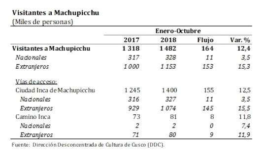 En este periodo, Machupicchu recibió 1,5 millones de visitantes, mayor en 12.4% frente a igual periodo de 2017. Esto respondió principalmente al aumento en 15.3% del número de turistas extranjeros (equivalente a 153,000 personas).